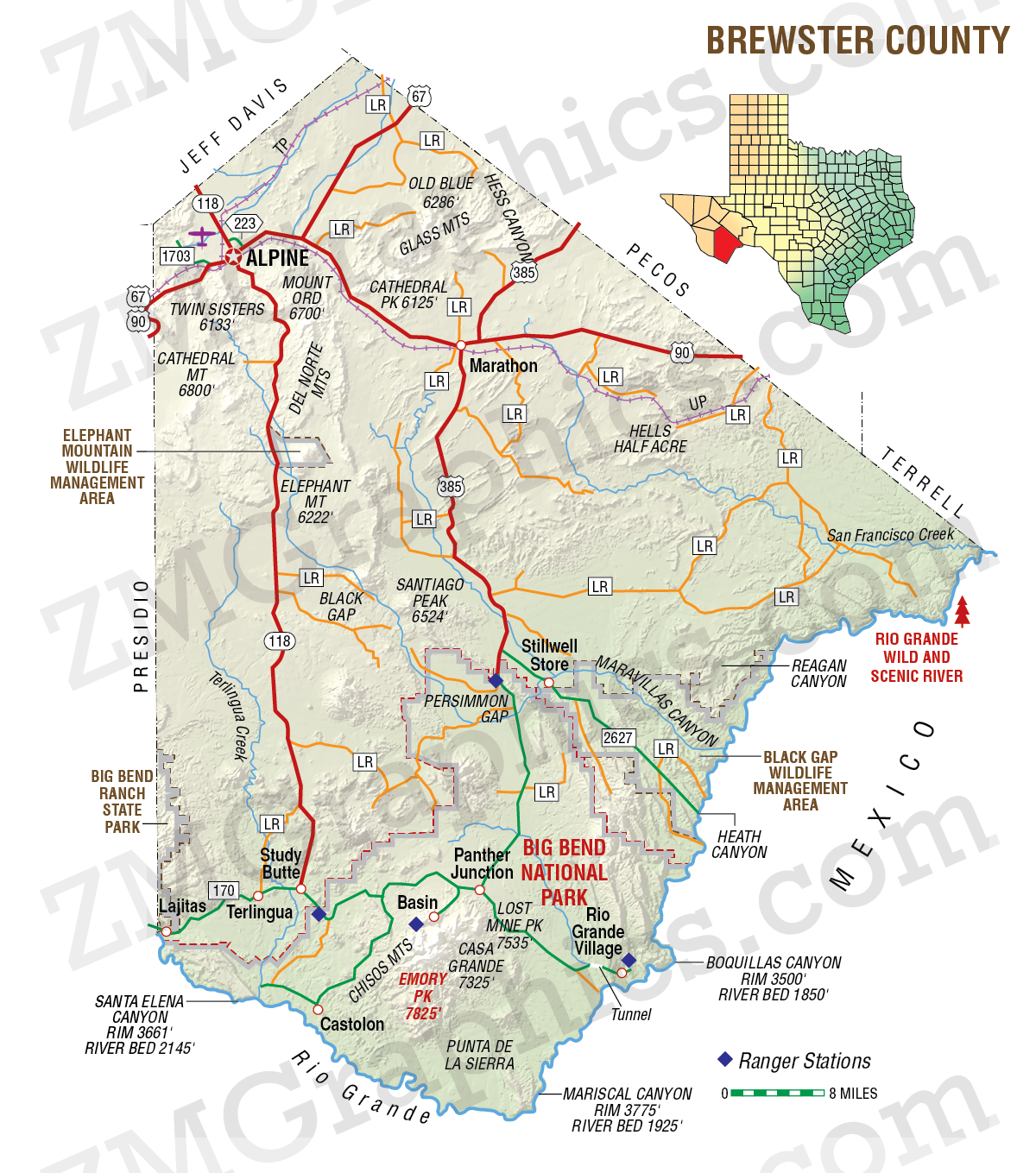 Historic pen-and-ink map of Brewster County, Texas. I reworked 254 of these county maps into the full-color, vector, topographical maps.